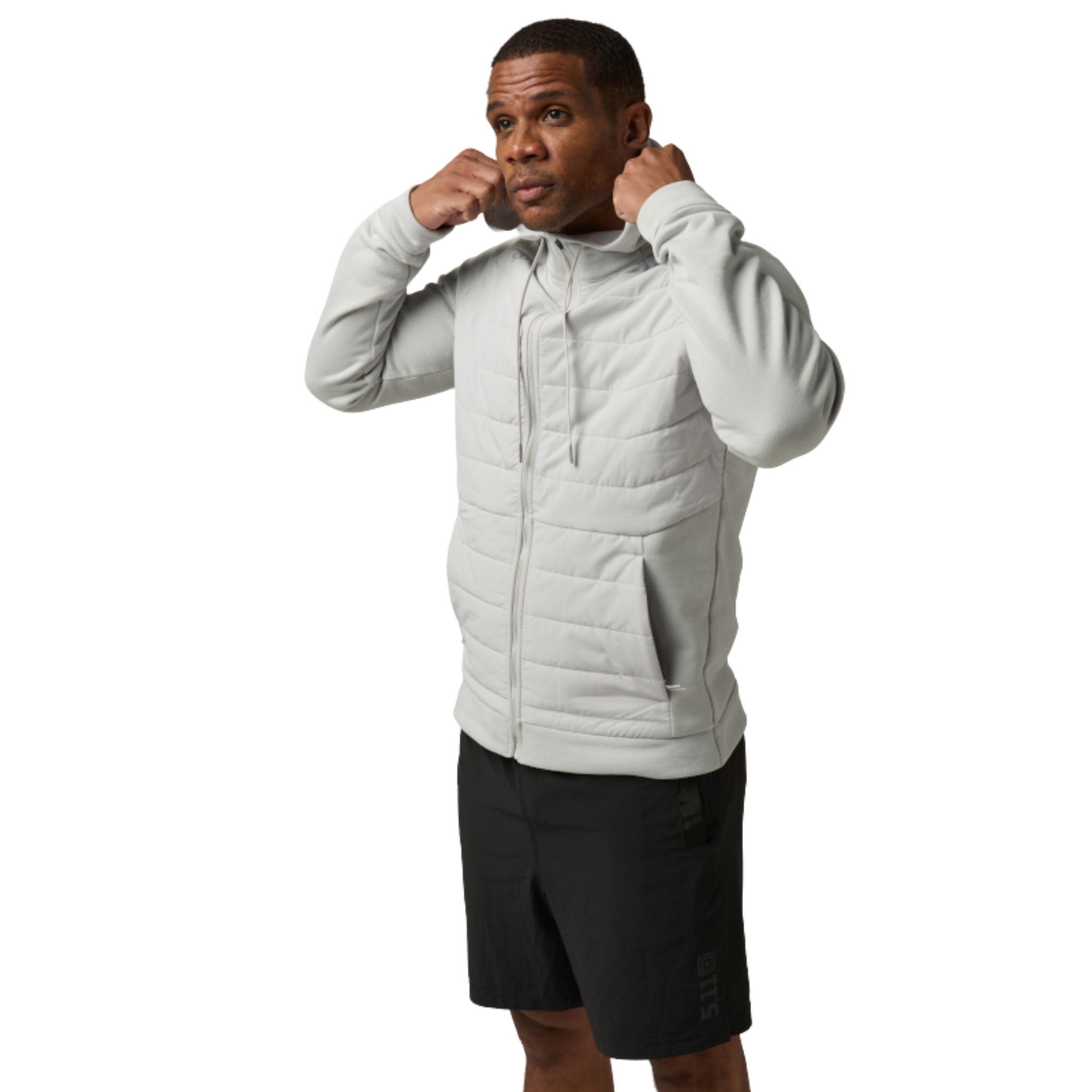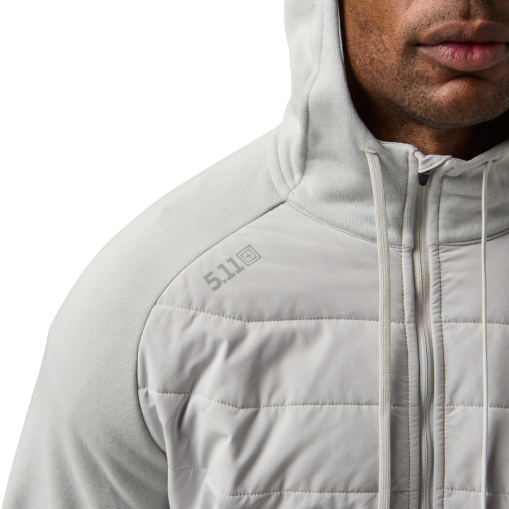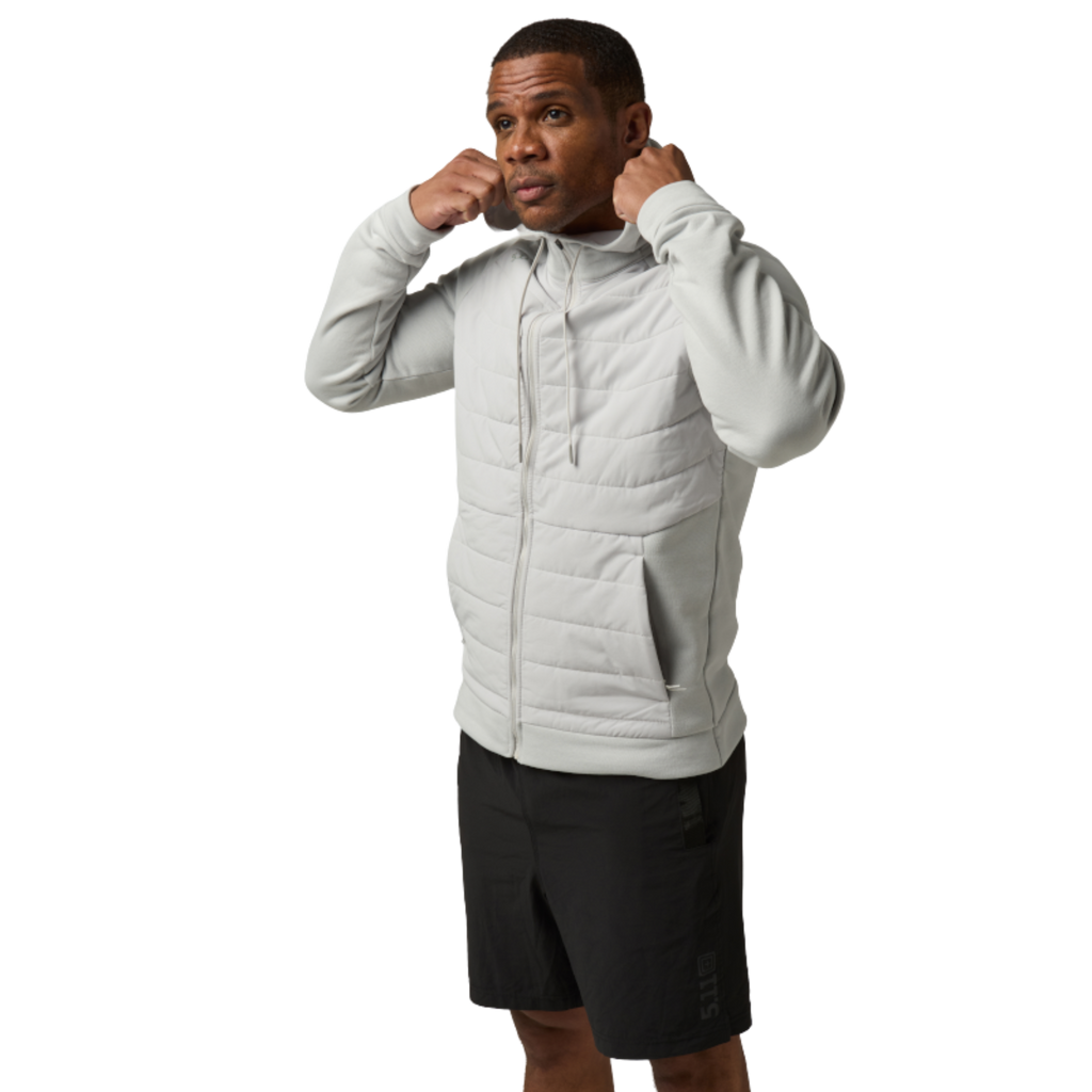 Designed for pre- and post-workout wear, the PT-R Arrive Hybrid Hoodie combines lightweight PrimaLoft® insulation with quilted panels and fleece construction for all-day warmth and mobility. Store essentials safely in zippered kangaroo pockets plus a hidden security pocket for ID, cash, or cards. The sculpted, three-panel hood with drawcords and chin guard ensures coverage and comfort, whether you’re warming up, training, or cooling down.