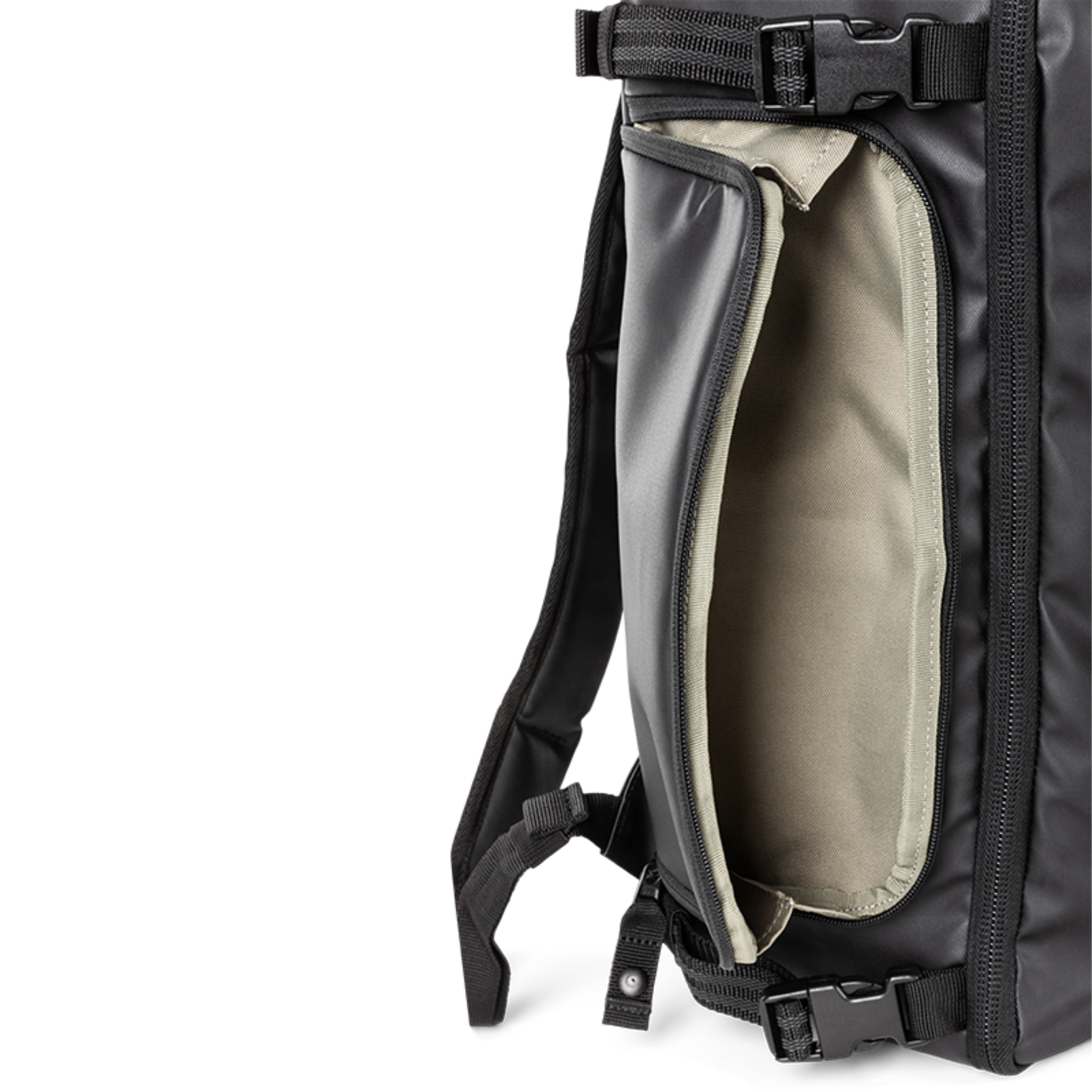 The 35-liter main compartment features a full clamshell opening for instant access to life-saving equipment. Inside, a light-coloured lining provides high contrast for low-light use, while a customizable system of one vertical and four horizontal dividers keeps contents secure and prevents shifting.