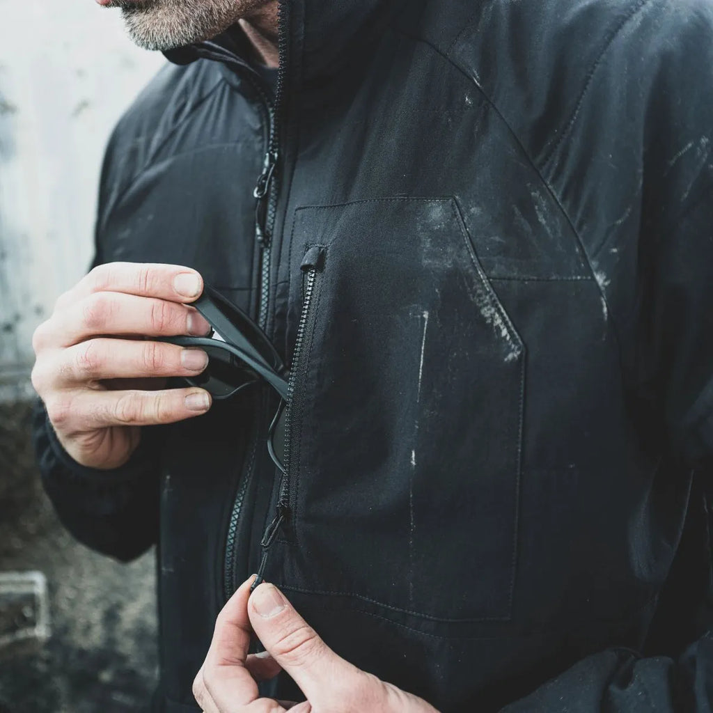 Secure Storage: Snap-closure hand pockets, chest zip pocket, and internal elastic card/phone pocket.