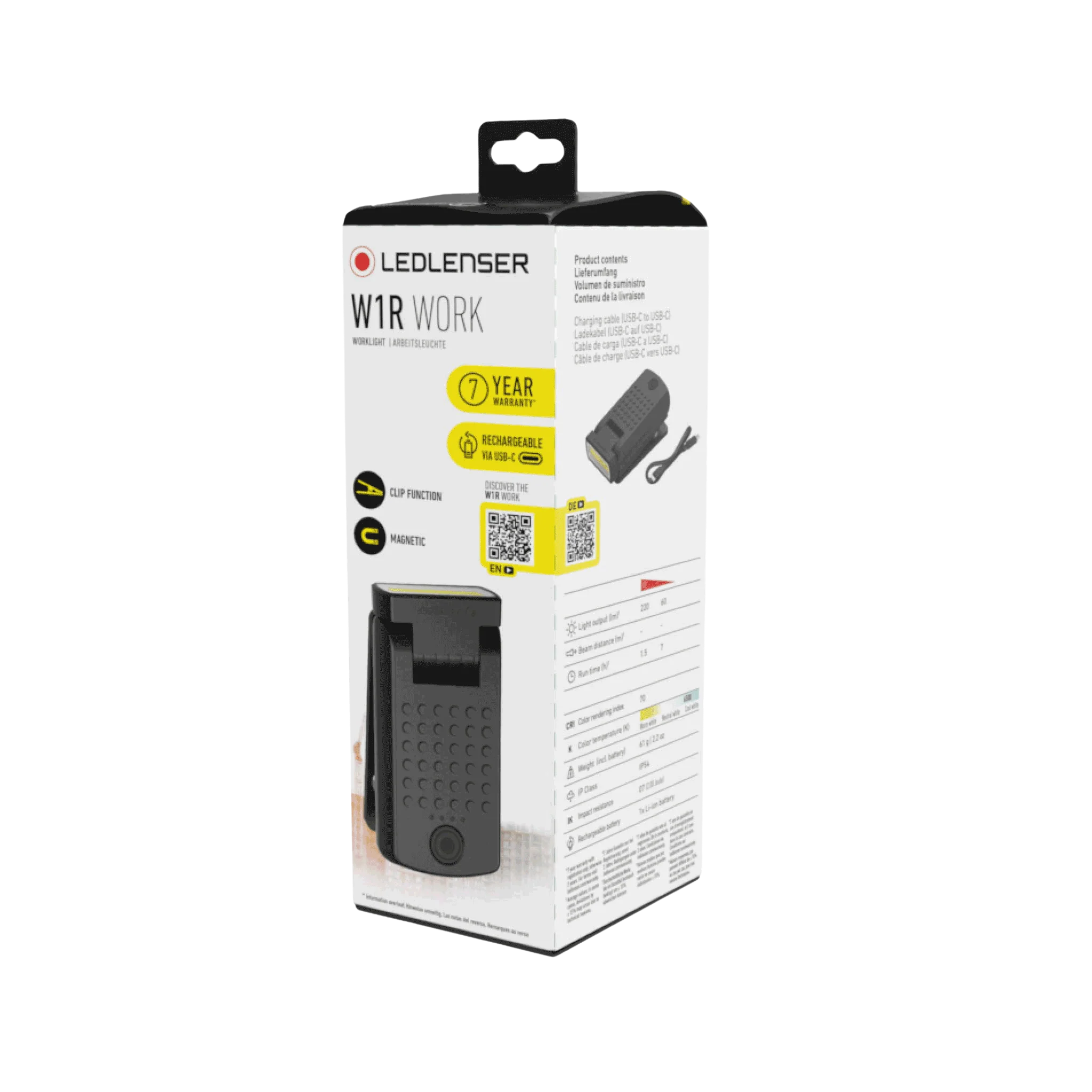 The superior Ledlenser light quality provides precise illumination with two different brightness levels. Thanks to its 360° swivel joint and swivelling lamp head, the W1R Work directs light exactly where it is needed. The integrated battery is quickly and easily recharged via USB-C.