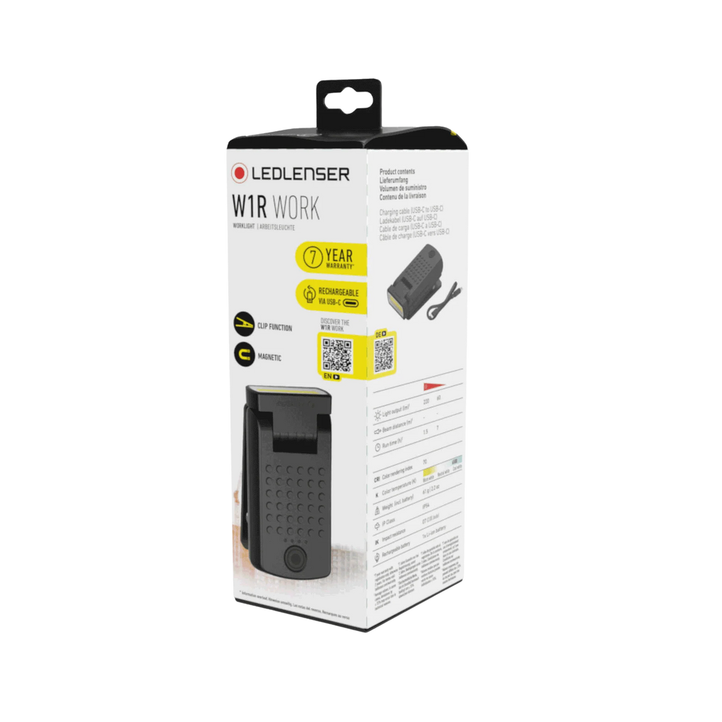 The Ledlenser W1R Work Clip Light is an ultra-compact, powerful, and versatile lighting tool perfect for tradespeople, security personnel, and DIY fans. Weighing only 61 grams, this handy light is designed to be easily attached via its clip or integrated magnet to work clothing, caps, or metal surfaces, keeping your hands free.